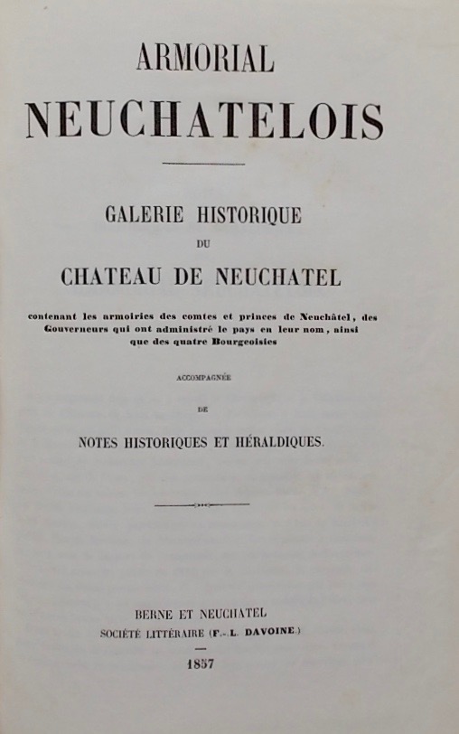 BOVET (Félix) Armorial neuchâtelois: Galerie historique du Château de Neuchâtel contenant les armoiries des comtes et princes de Neuchâtel, des gouverneurs qui ont administré le pays en leur nom, ainsi que des quatre bourgeoisies, accompagné de notes historiques et héraldiques. Berne et Neuchâtel, Société Littéraire (F.-L. Davoine), 1857.