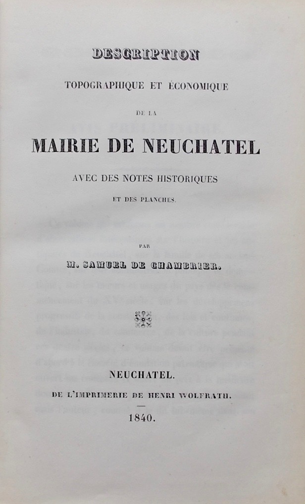 CHAMBRIER (Samuel de) Description topographique et économique de la Mairie de Neuchâtel. Neuchâtel, Henri Wolfrath, 1840.