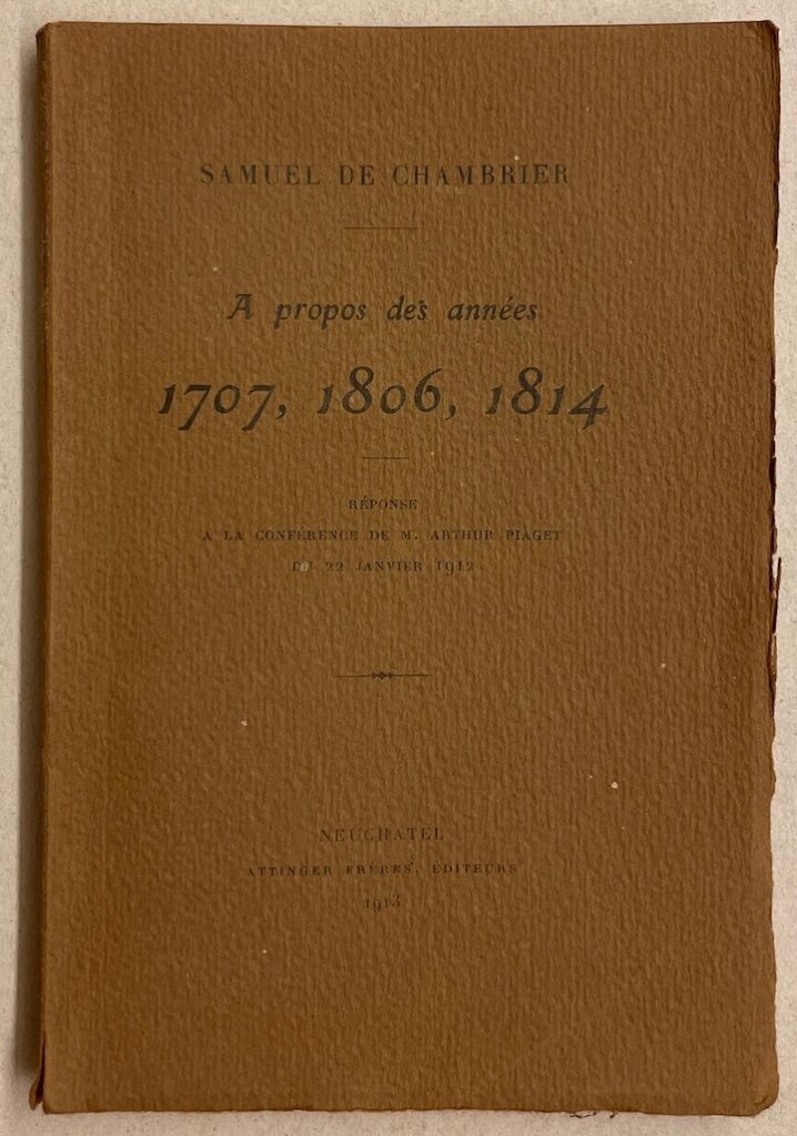 CHAMBRIER (Samuel de) A propos des années 1707, 1806, 1814. Réponse à la conférence de M. Arthur Piaget du 22 janvier 1912. Neuchâtel, Attinger Frères, 1913.