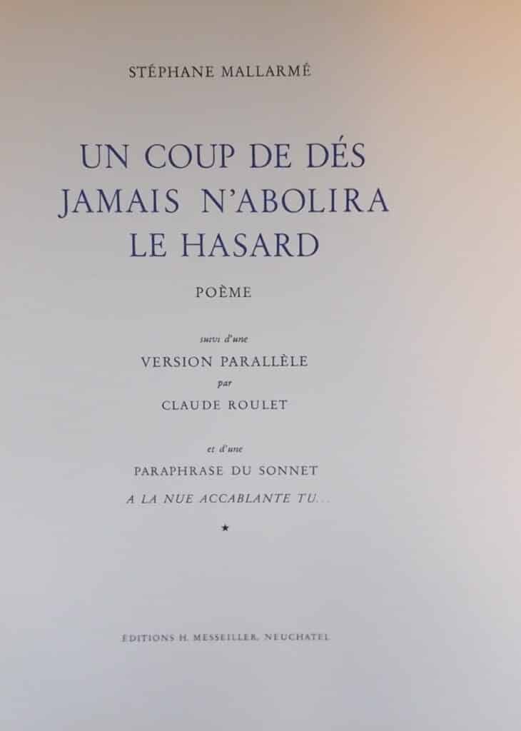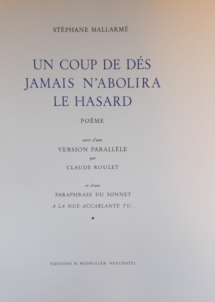 MALLARME (Stéphane) – ROULET (Claude) Un coup de dés jamais n’abolira le hasard. Poème, suivi d’une version parallèle par Claude Roulet, et d’une paraphrase du sonnet A la nue accablante tu…. Neuchâtel, Messeiller, 1960.