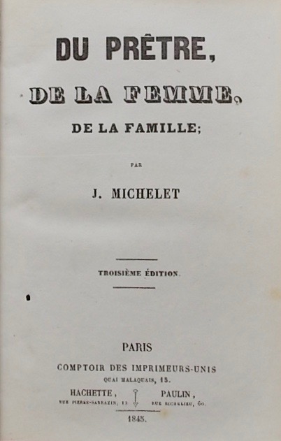 MICHELET (Jules) Du prêtre, de la femme, de la famille. Paris, Comptoir des Imprimeurs-Unis, Hachette, Paulin, 1845.