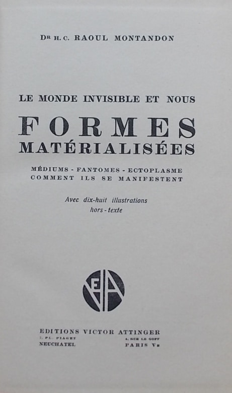 MONTANDON (Raoul) Le monde invisible et nous II: Formes matérialisées. Médiums – Fantômes – Ecloplasmes. Comment ils se manifestent. Neuchâtel, Victor Attinger, 1946.
