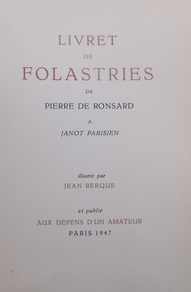 RONSARD (Pierre de) Livret de Folastries de Pierre de Ronsard à Janot Parisien. Paris, Aux dépens d’un Amateur, 1947.