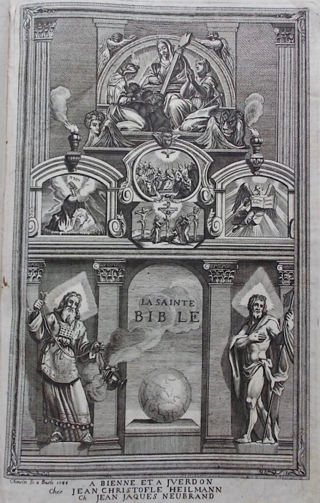 [Bible] - MARTIN (Mr) - SCHOLL (Samuel) La Sainte Bible, du Vieux et du Nouveau Testament. Suivant la version ordinaire des Eglises réformées, revue sur les originaux, et retouchée dans le langage. Avec des préfaces particulières sur chacun des Livres de l'Ecriture sainte, tirées de la Bible de Mr. Martin. Nouvelle édition, revue et corrigée par Samuel Scholl, pasteur de l'Eglise françoise de Bienne. A Bienne et à Yverdon, Jean Christoph Heilmann et Jean Jacques Neubrand, 1746.