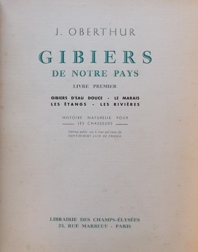 OBERTHUR (Joseph) Gibiers de notre pays. Livre premier: Gibiers d'eau douce - Le marais - Les étangs - Les rivières. Livres second: Gibiers marins - La mer et ses rivages. Paris, Librairie des Champs-Elysées, 1936-1937.