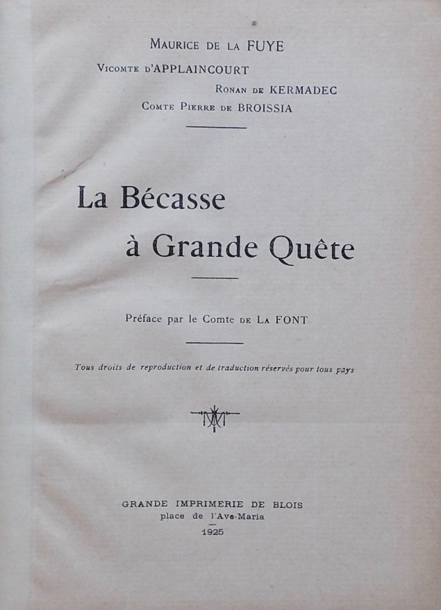 LA FUYE (Maurice de) - Vicomte d'APPLAINCOURT - KERMADEC (Ronan de) - BROISSIA (Comte Pierre de) La Bécasse à Grande Quête. Blois, Grande Imprimerie de Blois, 1925.