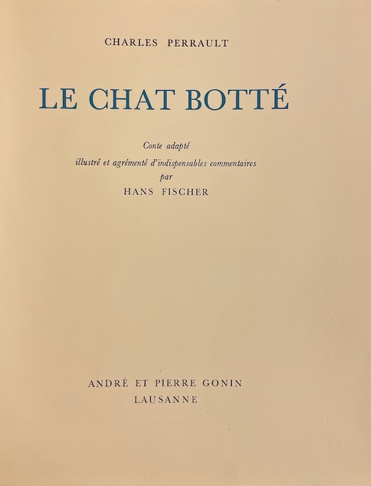 PERRAULT (Charles) - FISCHER (Hans) ill. Le chat botté. Conte adapté, illustré et agrémenté d'indispensables commentaires par Hans Fischer. Lausanne, Pierre Gonin, 1960.