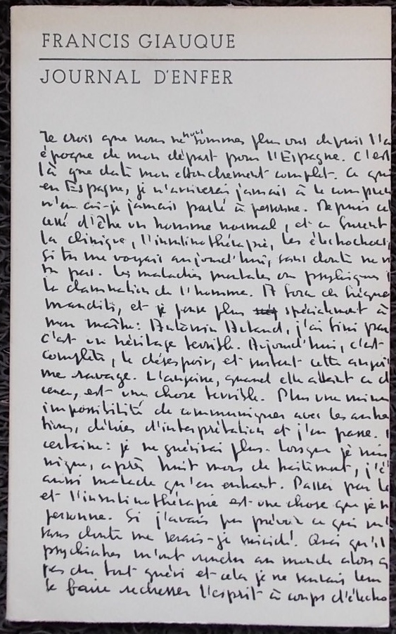 GIAUQUE (Francis) Journal d'enfer. [Paris], Repères, 1978