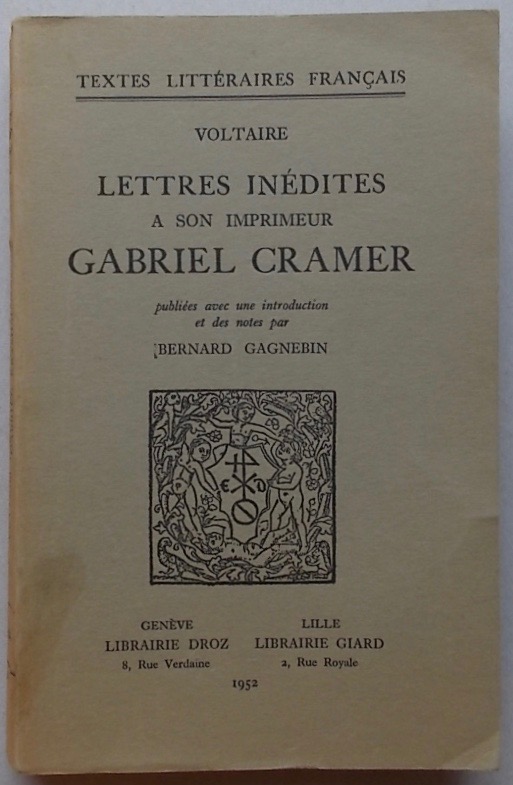 VOLTAIRE (François Marie Arouet) Lettres inédites à son imprimeur Gabriel Cramer. Genève, Librairie Droz, 1952.