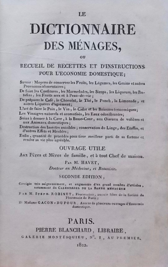 HAVET (Armand-Ernest) Le dictionnaire des ménages, ou recueil de recettes et d'instructions pour l'économie domestique. Paris, Pierre Blanchard, 1822.