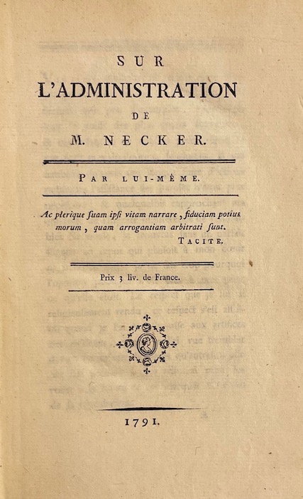 NECKER (Jacques) Sur l'administration de M. Necker, par lui-même. Sans lieu, sans nom, 1791.