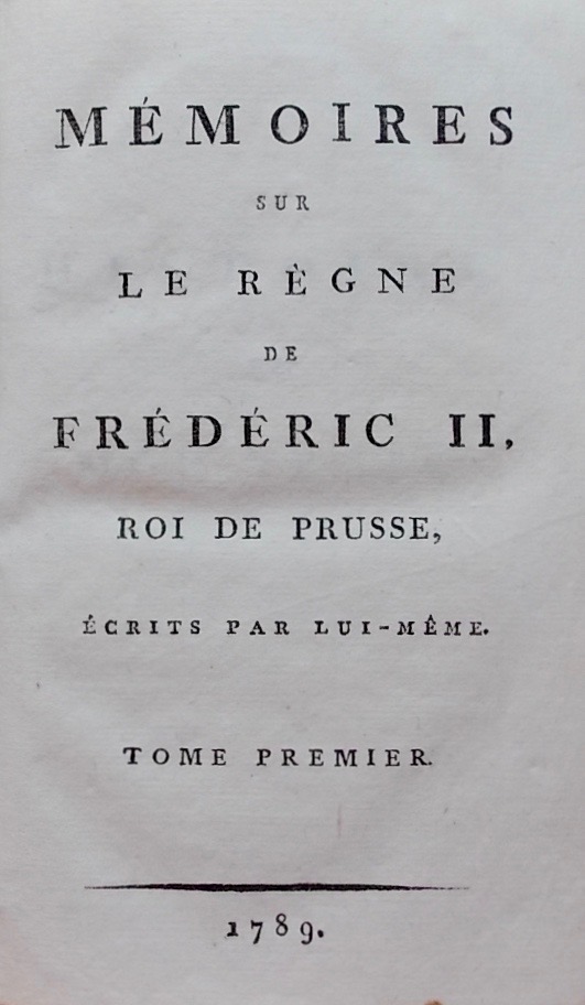 FREDERIC II, Roi de Prusse Oeuvres posthumes de Frédéric II, Roi de Prusse. Tomes 1 à 3: Mémoires sur le règne de Frédéric II, Roi de Prusse, écrits par lui-même. Tomes 4 à 10: Correspondance. Tomes 11 et 12: Mélanges. [Bâle], sans nom, 1789.