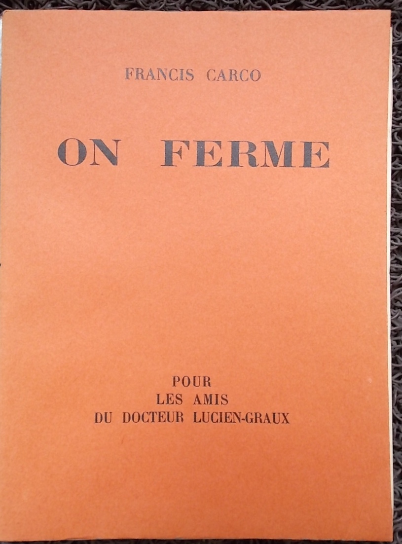 CARCO (Francis) On ferme. Sans lieu, Pour les amis du docteur Lucien-Graux, 1930.