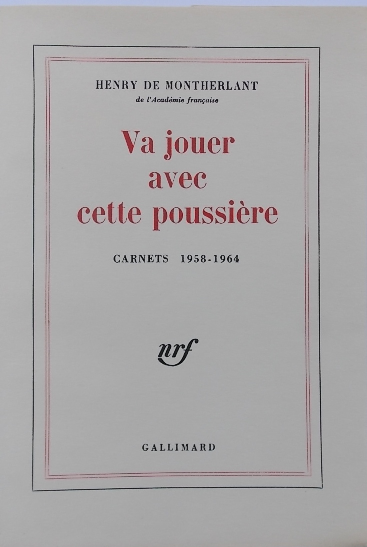 MONTHERLANT (Henry de) Va jouer avec cette poussière (Carnets 1958-1964). Paris, Gallimard, 1966.