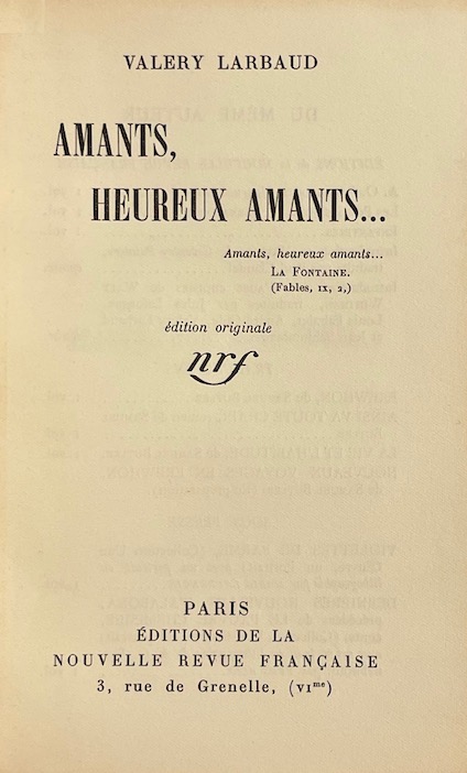 LARBAUD (Valery) Amants, heureux amants... Paris, Editions de La Nouvelle Revue Française, 1923.