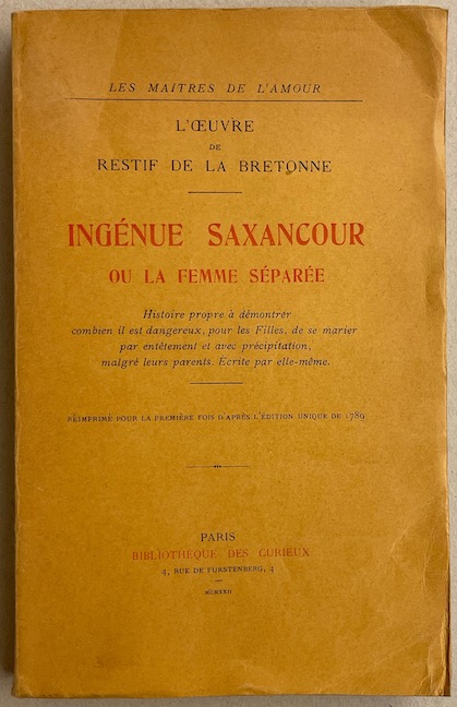 RESTIF DE LA BRETONNE (Nicolas-Edmé) L'oeuvre de Restif de la Bretonne, deuxième partie. Ingénue Saxancour ou la femme séparée. Histoire propre à démontrer combien il est dangereux, pour les filles, de se marier par entêtement et avec précipitation, malgré leurs parents. Ecrite par elle-même. Paris, Bibliothèque des Curieux (coll. Les Maîtres de l'Amour), 1922.