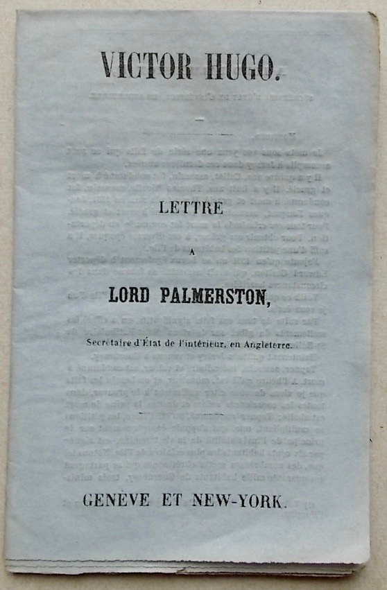HUGO (Victor) Lettre à Lord Palmerston, Secrétaire d'Etat de l'intérieur, en Angleterre. Genève et New-York, sans nom, sans date [Saint-Hélier, Imprimerie Universelle, 1854].