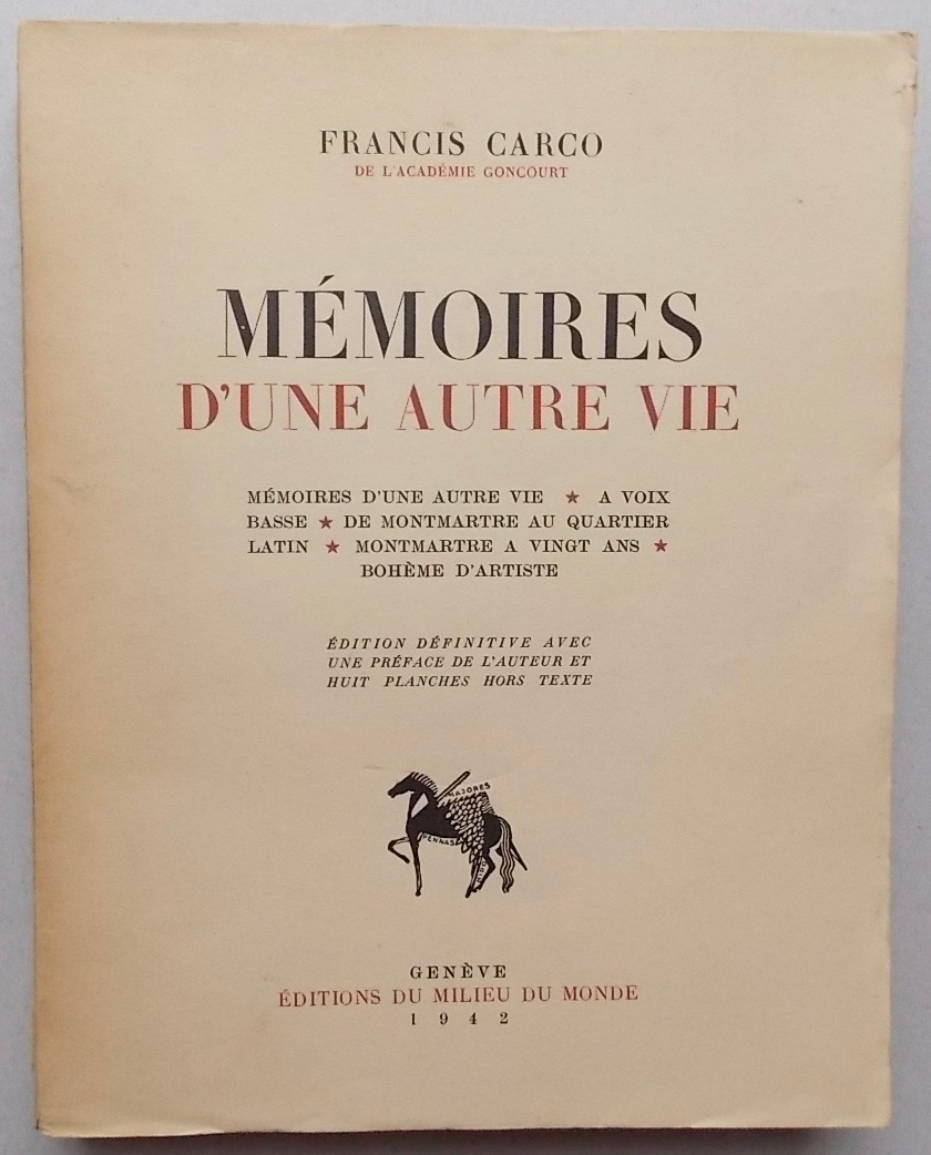 CARCO (Francis) Mémoires d'une autre vie. Genève, Editions du Milieu du Monde, 1942.