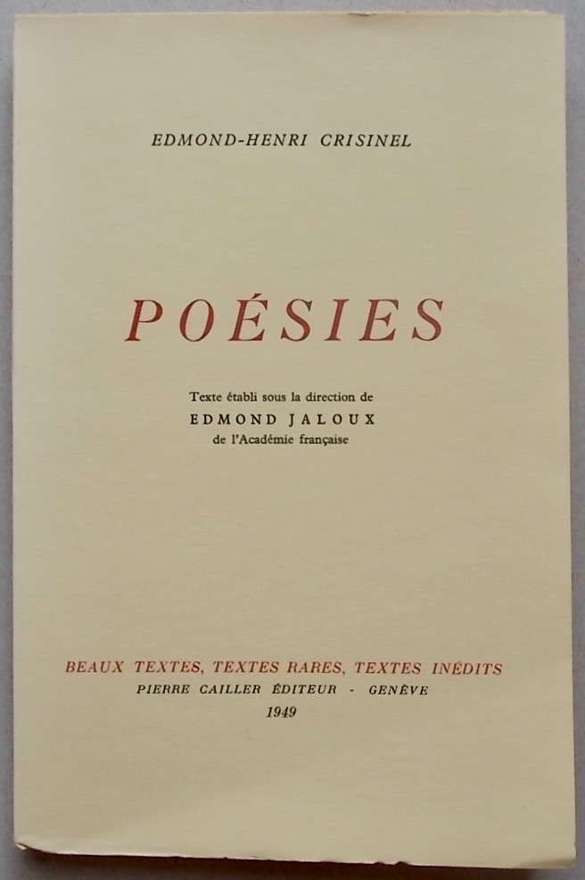 CRISINEL (Edmond-Henri) Poésies. Genève, Cailler (coll. Beaux textes, textes rares, textes inédits), 1949.