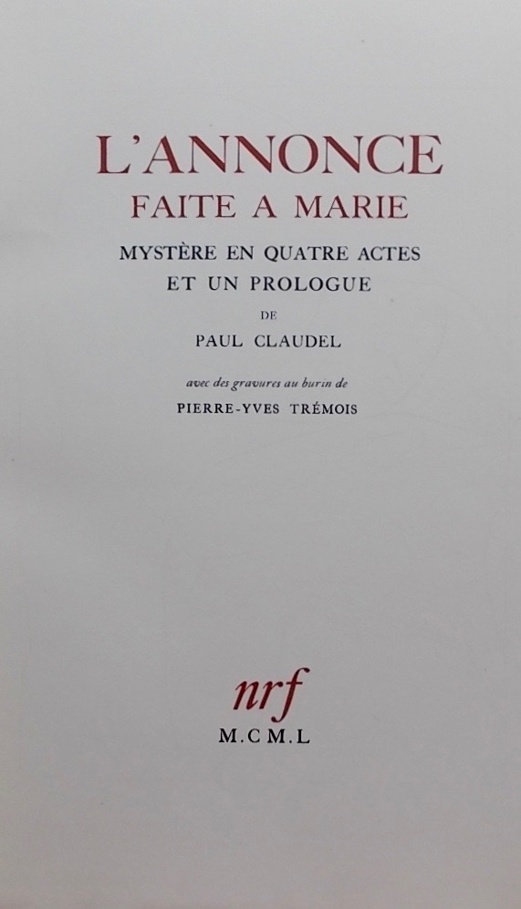 CLAUDEL (Paul) - TREMOIS (Pierre-Yves) L'annonce faite à Marie. Paris, NRF - Gallimard, 1951.
