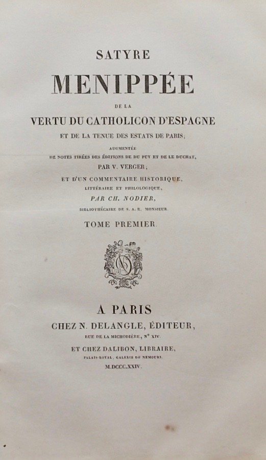 NODIER (Charles) intro. Satyre Menippée de la vertu du catholicon d'Espagne et de la tenue des estats de Paris; augmentés de notes tirées des éditions de Du Puy et de Le Duchat, et d'un commentaire historique, littéraire, et philologique, par Ch. Nodier, bibliothécaire de S.A.R. Monsieur Paris, chez Delangle & chez Dalibon, 1824.