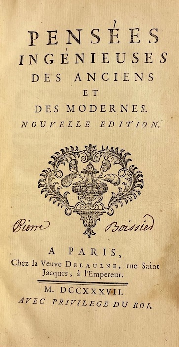[BOUHOURS (Dominique)] Pensées ingénieuses des anciens et des modernes. Nouvelle édition. A paris, Chez la Veuve Delaulne, 1737.