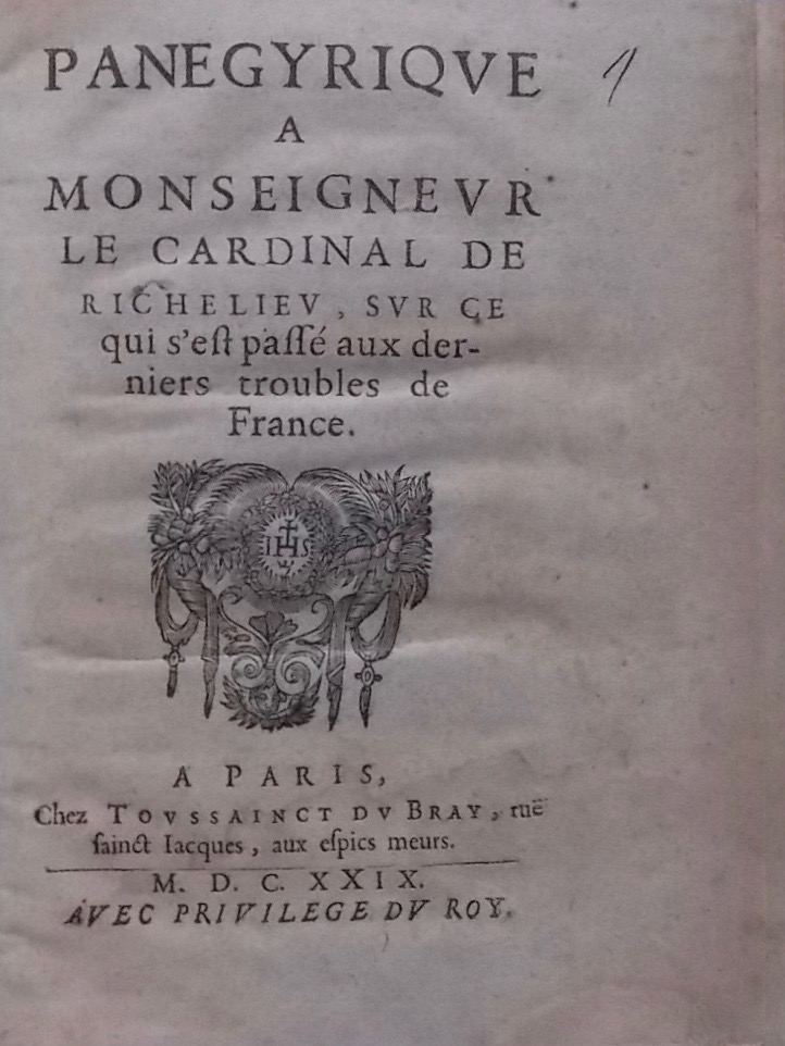 SILHON (Jean de) Panégyrique à Monsieur le Cardinal de Richelieu, sur ce qui s'est passé aux derniers troubles de France. A Paris, chez Toussainct Du Bray, 1629.