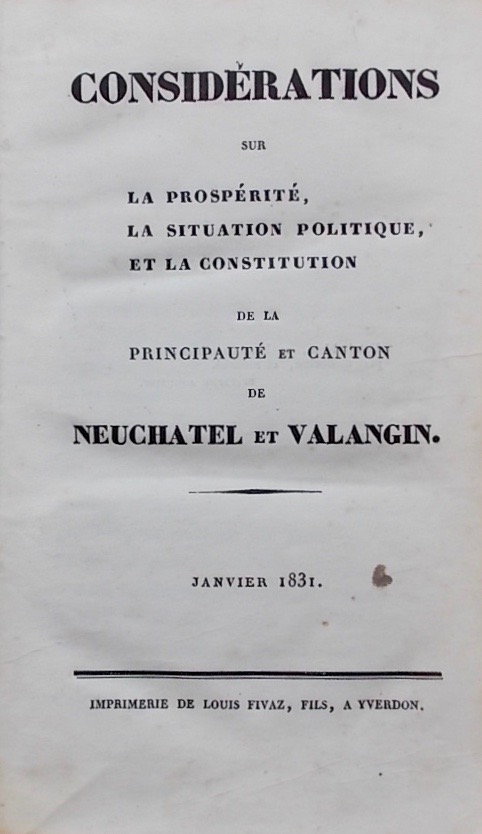 [DUBOIS-REYMOND (Félix-Henri)] Considérations sur la prospérité, la situation politique et la Constitution de la Principauté et canton de Neuchâtel et Valangin. Yverdon, Louis Fivaz, 1831.