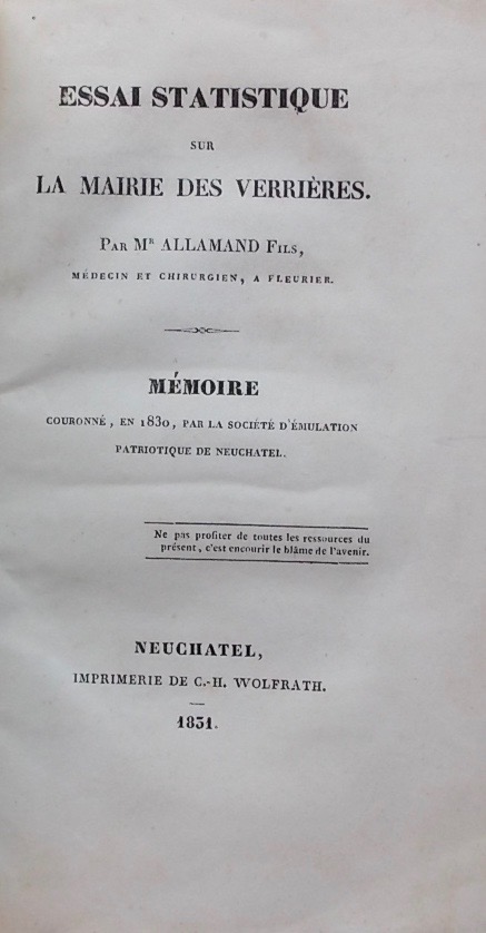 ALLAMAND [Charles-Henri] Essai statistique sur la mairie des Verrières. Neuchâtel, Imprimerie de Henri Wolfrath, 1831.
