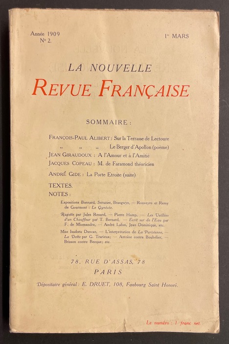 [GIDE] La Nouvelle Revue Française. Revue mensuelle de Littérature et de critique. N° 2 - Année 1909. 1er mars. Paris, NRF, 1909.