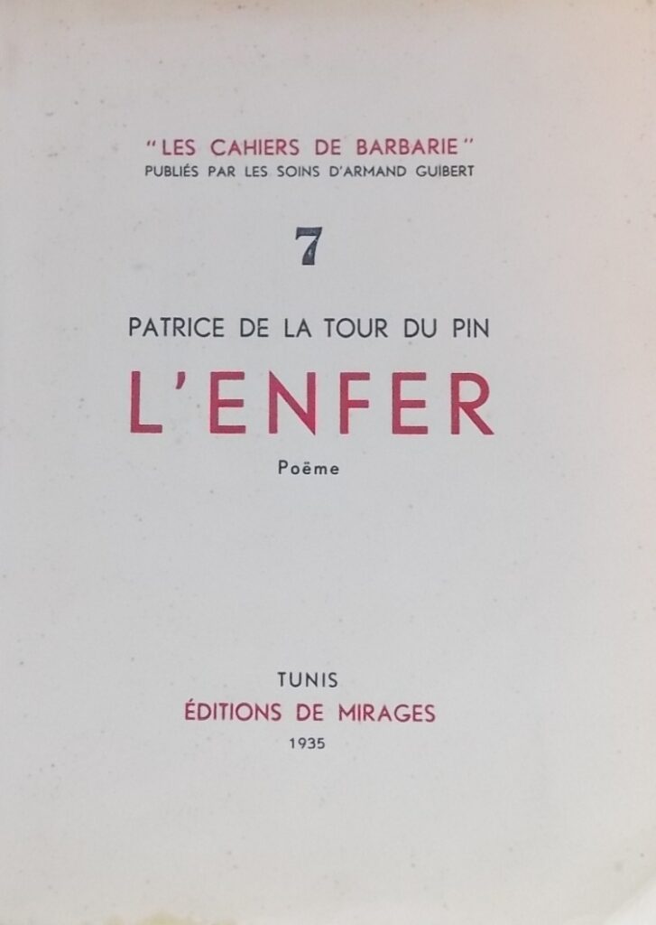 LA TOUR DU PIN (Patrice) L’Enfer. Poëme. Tunis, Editions du Mirage (coll. Les cahiers de Barbarie), 1935.