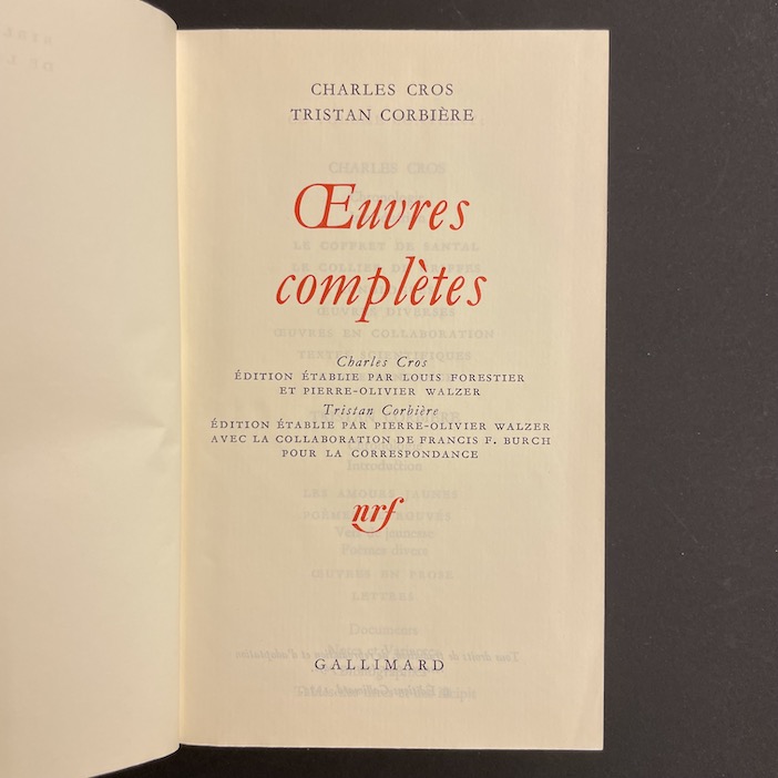 CROS (Charles) – CORBIERE (Tristan) Oeuvres complètes. Paris, Gallimard (coll. Bibliothèque de la Pléiade), 1970.