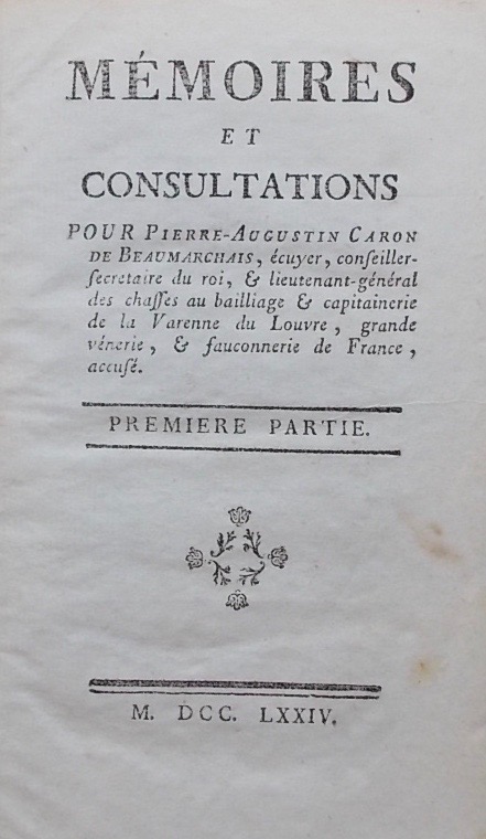 BEAUMARCHAIS (Pierre Augustin Caron de) Mémoires et consultations pour Pierre-Augustin Caron de Beaumarchais, écuyer, conseiller-secrétaire du roi, & lieutenant-général des chasses au baillage & capitainerie de la Varenne du Louvre, grande vénerie, & fauconnerie de France, accusé. Première partie. Sans lieu, sans nom, 1774.