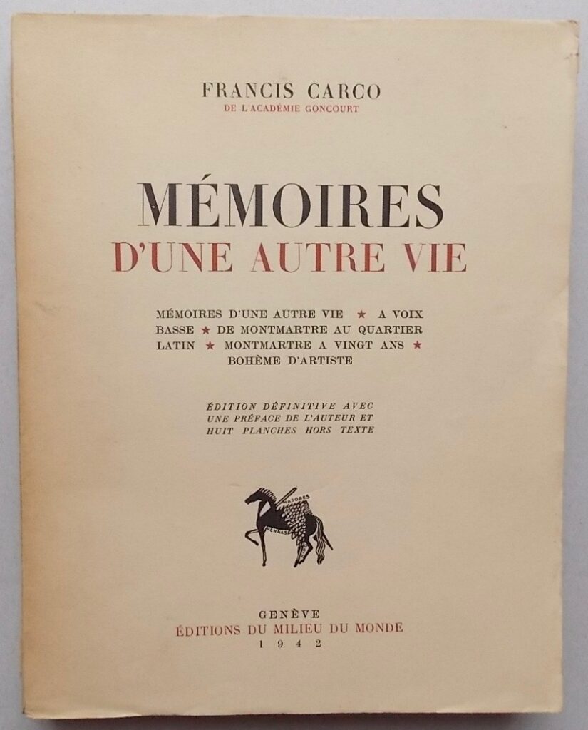 CARCO (Francis) Mémoires d’une autre vie. Genève, Editions du Milieu du Monde, 1942.