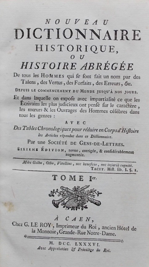 *** Nouveau dictionnaire historique, ou histoire abrégée de tous les hommes qui se sont fait un nom par des Talens, des Vertus, des Forfaits, des Erreurs, etc. depuis le commencement du monde jusqu’à nos jours. […] Caen, G. le Roy, 1786.