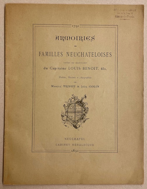 TRIPET (Maurice) & COLIN (Jules) Armoiries des familles neuchâteloises, tirées du manuscrit du capitaine Louis Benoit, fils. Neuchâtel, Cabinet Héraldique, 1891.