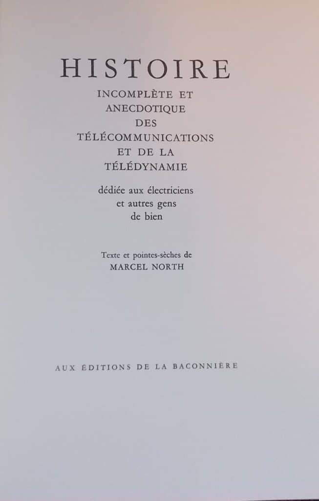 NORTH (Marcel) Histoire incomplète et anecdotique des télécommunications et de la télédynamie, dédiée aux électriciens et autres gens de bien. Neuchâtel, La Baconnière, 1954.