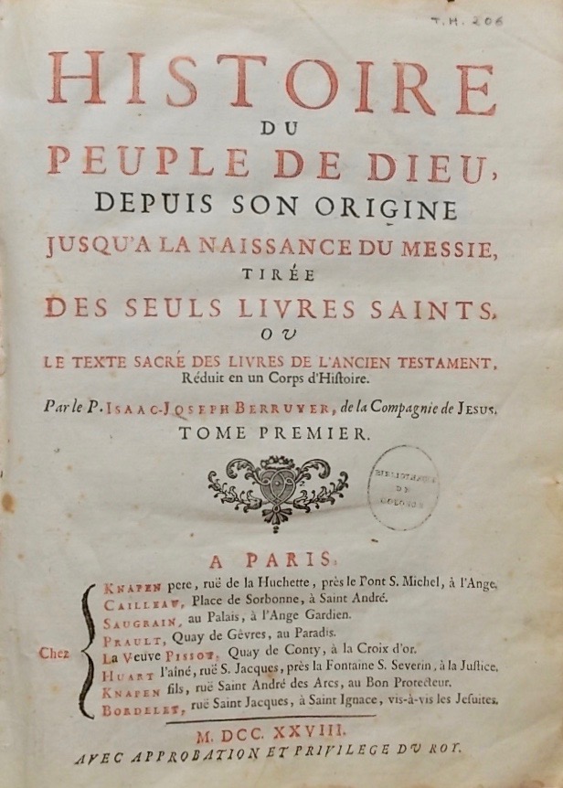 BERRUYER (Isaac-Joseph) Histoire du peuple de Dieu, depuis son origine jusqu’à la naissance du Messie, tirée des seuls Livres Saints, ou Le texte sacré des livres de l’Ancien Testament, Réduits en un Corps d’Histoire. Paris, Knapen, Cailleau, et al…, 1928.