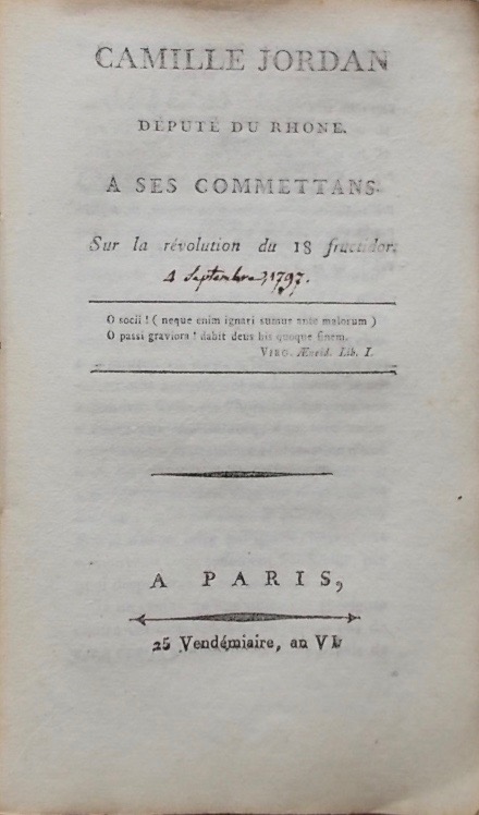 JORDAN (Camille) Camille Jordan, député du Rhône, à ses commettans. Sur la révolution du 18 fructidor. A Paris, sans nom, 25 Vendémiaire, an VI [1798].