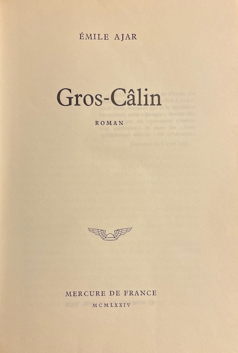 AJAR (Emile) [pseud. de Romain Gary] Gros-Câlin. Paris, Mercure de France, 1974.