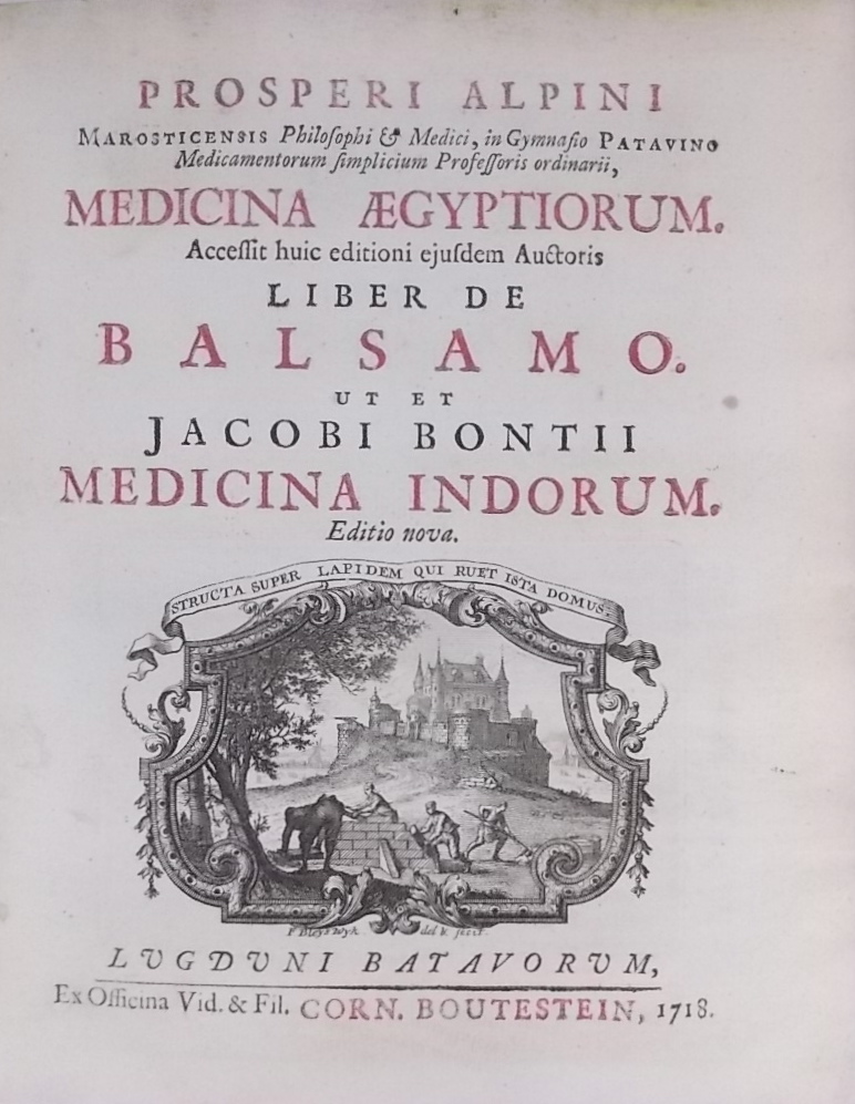ALPINUS (Prosper) – BONTIUS (Jacobus) Prosperi Alpini Medicina Aegyptiorum. Accessit eiusdem liber de balsamo, ut et Jacobi Bontii medicina Indorum. Lugduni Batavorum [Leyden], Ex Officina Vid. & Fil. Corn. Boutestein, 1718.