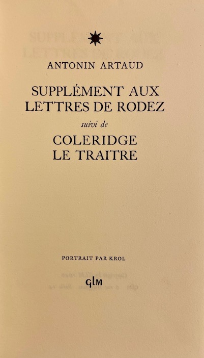ARTAUD (Antonin) Supplément aux lettres de Rodez suivi de Coleridge le traître. Paris, GLM, 1949.