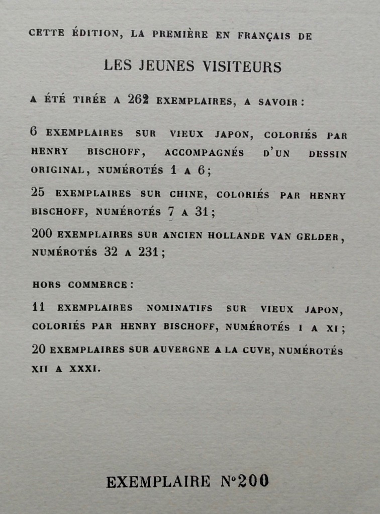 Edition originale numérotée 1/200 exemplaires sur Hollande van Gelder (après 6 Japon et 25 Chine). Préface de Jean Cocteau. Traduction de Maurice Sachs. Illustré de bois d’Henry Bischoff dont 6 rehaussés en couleurs. Exemplaire en parfaite condition.