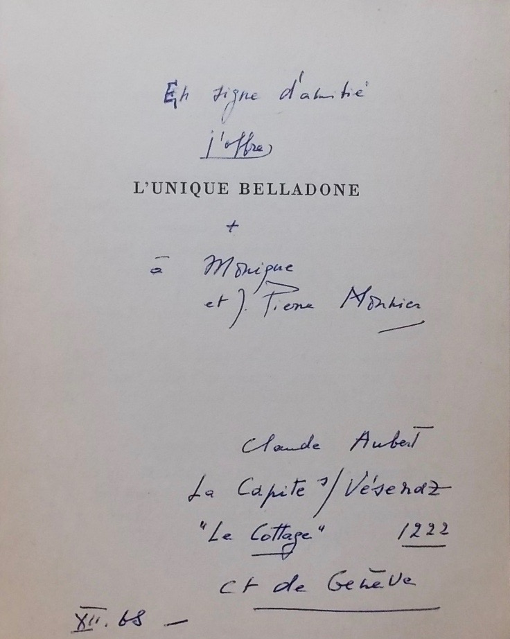 AUBERT (Claude) L’unique belladone. Lausanne, Payot (Petite collection poétique d’écrivains romands), 1968.