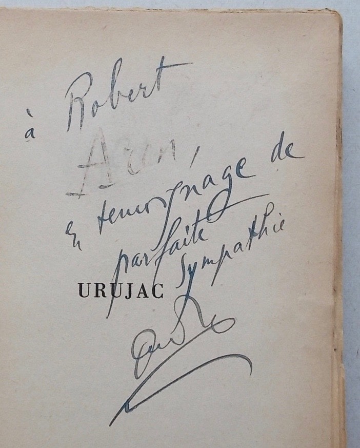 Edition originale dont il n’est pas annoncé de grand papier. Exemplaire du service de presse enrichi d’un envoi autographe signé de l’auteur sans doute à Robert Aron (Aron a été effacé à moitié).