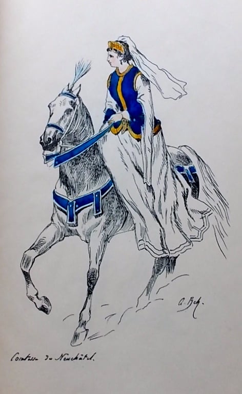 BACHELIN (Auguste) Costumes du cortège historique. 15 et 19 septembre 1887, à Neuchâtel. A l’occasion de la Vème exposition suisse d’agriculture. Croquis par Auguste Bachelin. [Neuchâtel], Lithographie Furrer, [1887].