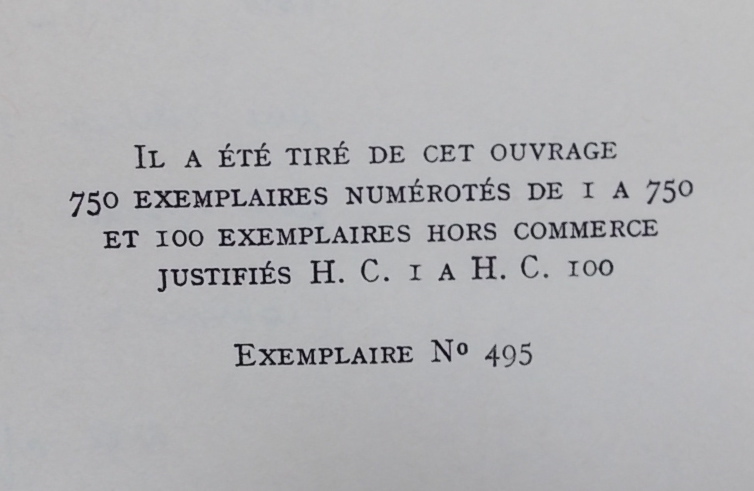 Edition originale. Un des 850 exemplaires numérotés sur vélin fin (seul tirage). Ex-dono manuscrit en page de garde. Sinon en parfaite condition.