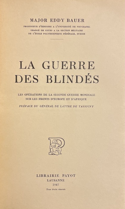 BAUER (Eddy) La guerre des blindés. Les opérations de la seconde guerre mondiale sur les fronts d’Europe et d’Afrique. Lausanne, Payot, 1947.