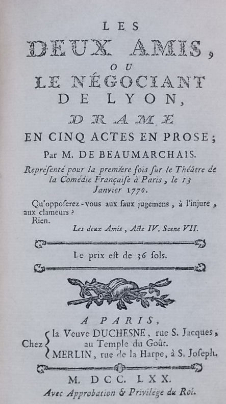 BEAUMARCHAIS (Pierre Augustin Caron de) Les deux amis, ou le négociant de Lyon. Drame en cinq actes en prose Paris, Veuve Duchesne et Merlin, 1770.