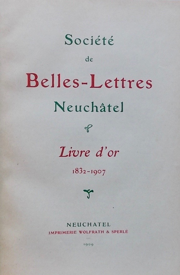 ![[BELLES-LETTRES] Société de Belles-Lettres de Neuchâtel. Livre d'Or 1832-1907. - Supplément au livre d'Or de 1907 à 1924. - IIe supplément publié à l'occasion de son centenaire (1832-1934). Neuchâtel, Imprimerie Wolfrath & Sperlé, 1909, puis Imprimerie Centrale , 1925 et 1935. – Image 4](https://cabinetamateur.ch/wp-content/uploads/2025/10/38225_4.jpg)